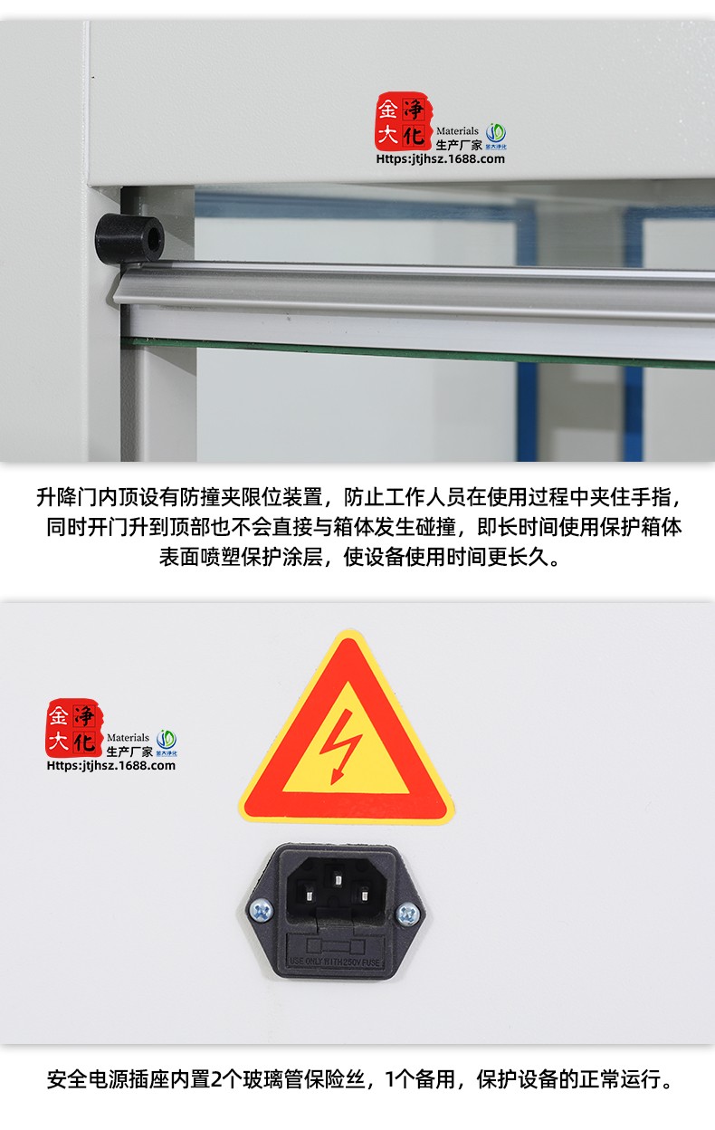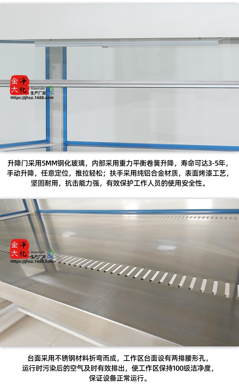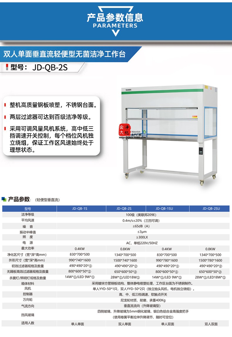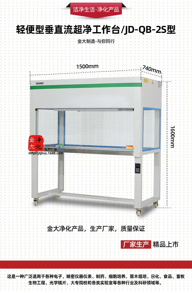 这款产品适用于食品、包装、医药、电子、化工、科研等行业,它的外形尺寸为1500宽*740深*1600高,工作区尺寸1340宽*700深*500高,适用人数2人/次,可三档调速,面板上有软触点控制开关,紫外线杀菌灯、照明灯,台面拉丝不锈钢。